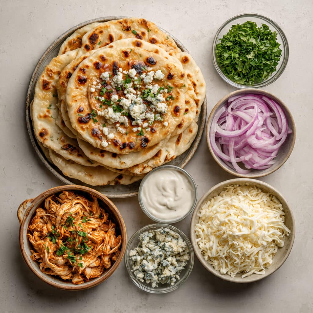 - Assemble the Dish: Evenly spread the buffalo chicken over each flatbread. Sprinkle with shredded mozzarella, add red onion slices, and scatter the crumbled blue cheese on top.