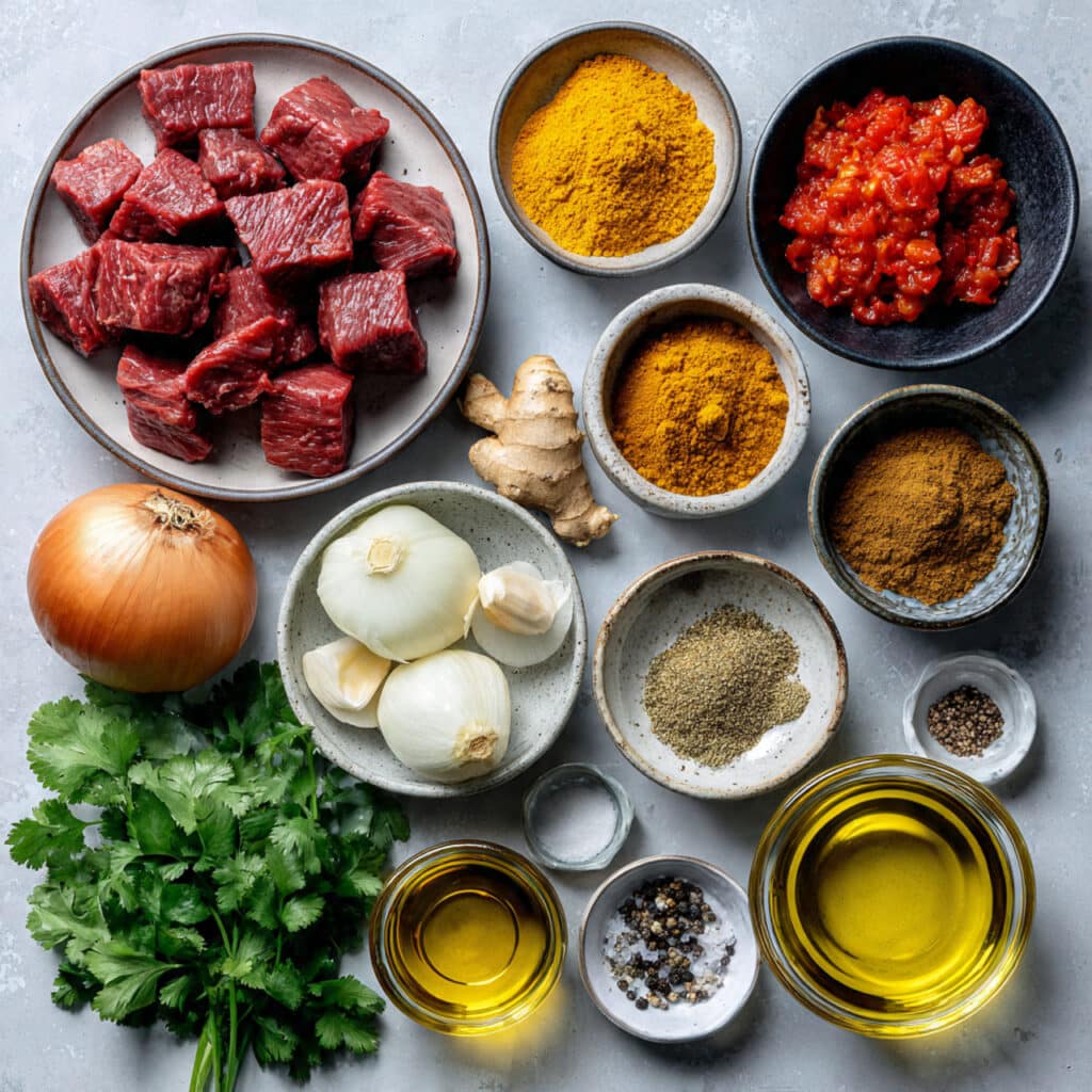 A cozy, spice-rich beef curry with tender beef cubes simmered in a thick tomato and onion sauce, finished with fresh cilantro and served hot over rice.