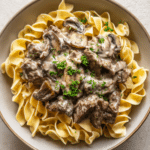 There is something deeply comforting about a bowl of creamy noodles topped with tender beef and rich mushroom sauce. The aroma alone fills the kitchen with warmth, and once the sauce starts simmering everything feels a little more relaxed. This dish comes together surprisingly fast, yet tastes like something that simmered all afternoon. Trust me, you’re going to love this one. It is cozy, creamy, savory, and honestly worth every bite.