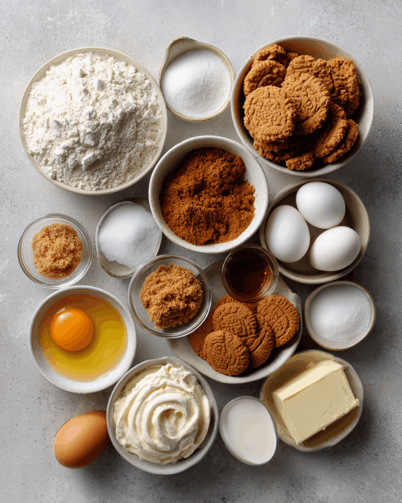 This cake brings together warm spices, creamy cookie butter, and a soft, tender base. Here’s what you’ll need: