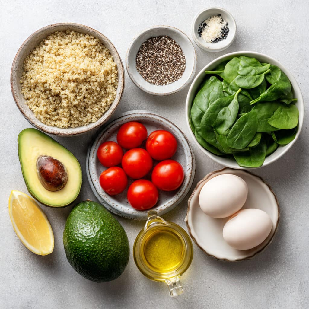 You can absolutely prep this bowl ahead of time. Store each component separately in airtight containers. Quinoa and eggs can be made up to 3 days ahead. Just slice avocado fresh before serving. Reheat quinoa and spinach gently before assembling.