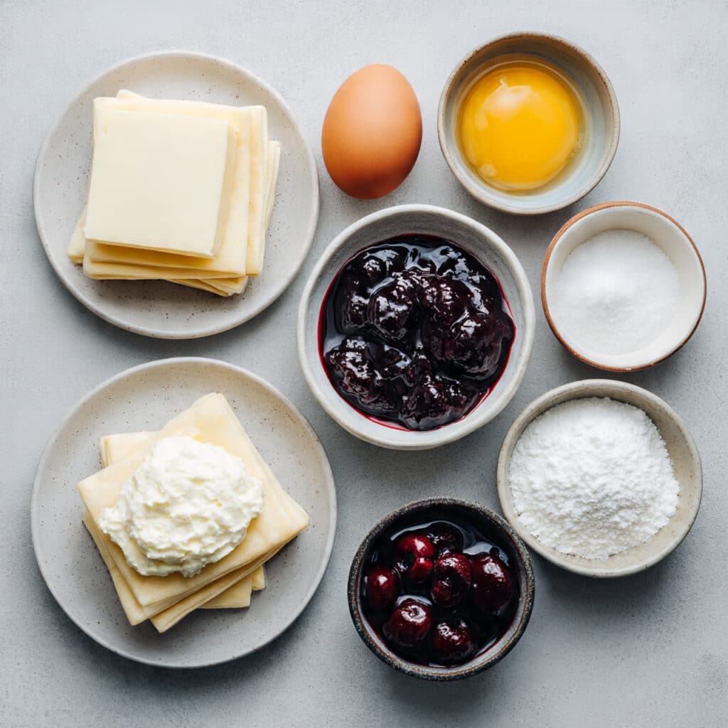 - Assemble the Dish: Cut puff pastry into squares. Add a spoonful of cheesecake filling in the center of each piece, then top with cherry filling.