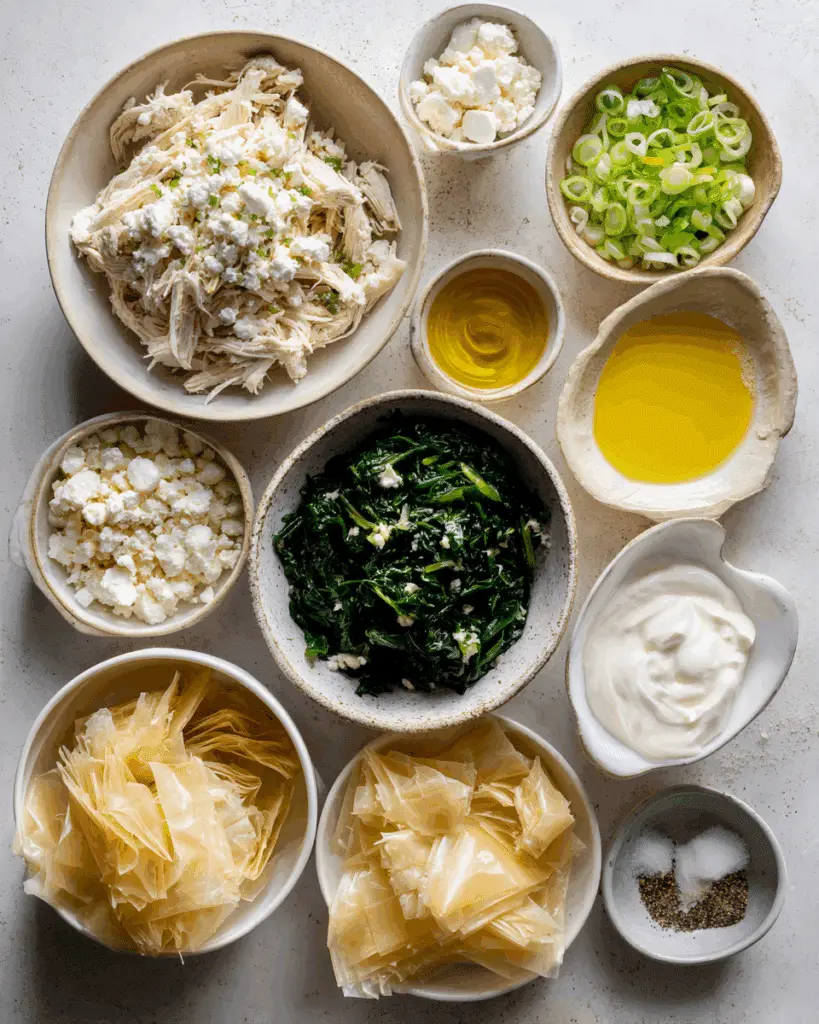 This filling is savory, creamy, and full of subtle texture thanks to a blend of tender chicken, creamy cheese, and fresh greens. Here’s what you’ll need: