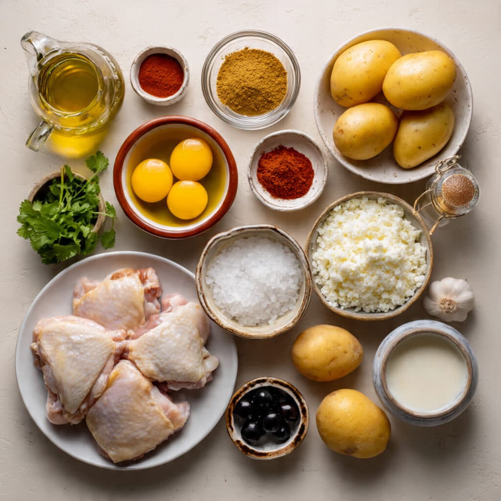- Serve over cooked white rice with boiled potatoes, sliced hard-boiled eggs, black olives, and chopped cilantro.
