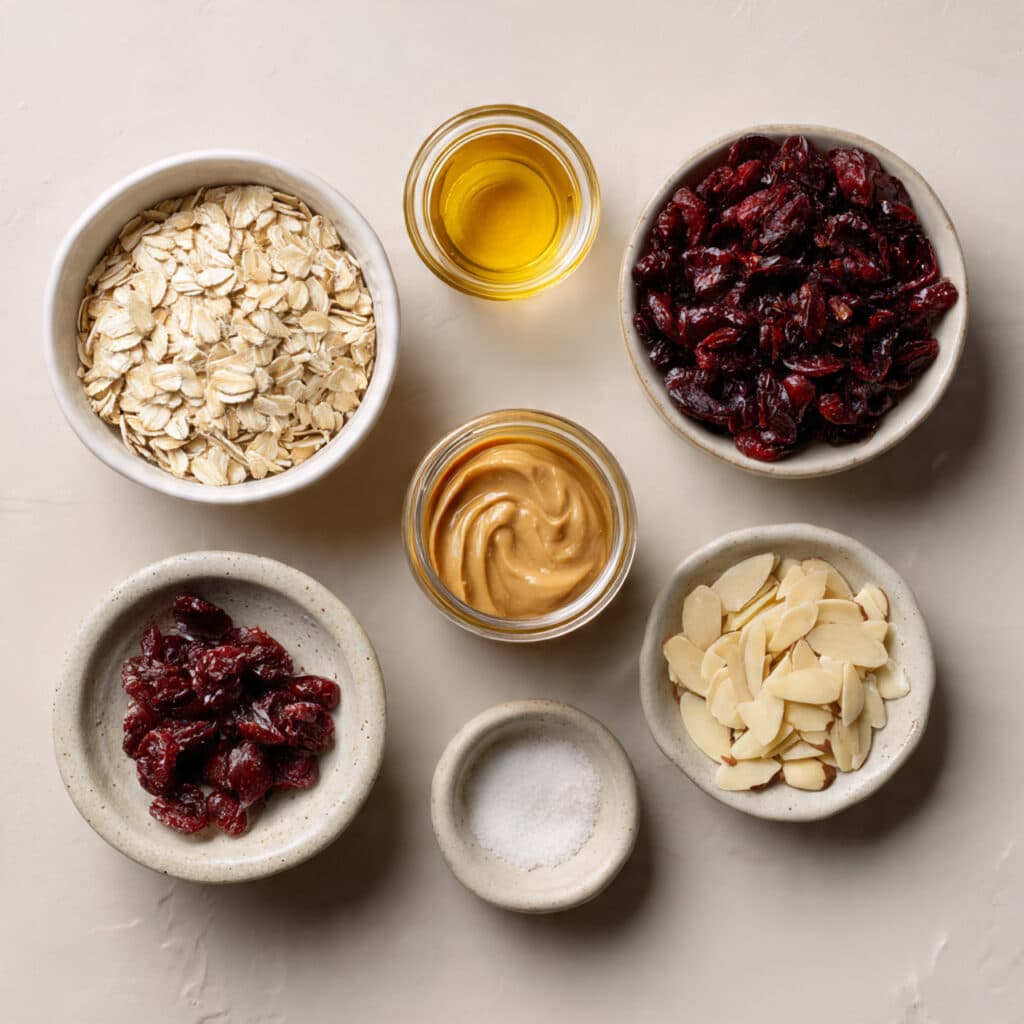 These bars strike a dreamy balance. The oats give them a soft, chewy core. Almonds add a delicate crunch that keeps each bite interesting. Honey and almond butter bring a subtle sweetness and rich mouthfeel, while cranberries surprise with little tangy bursts that cut through the richness.