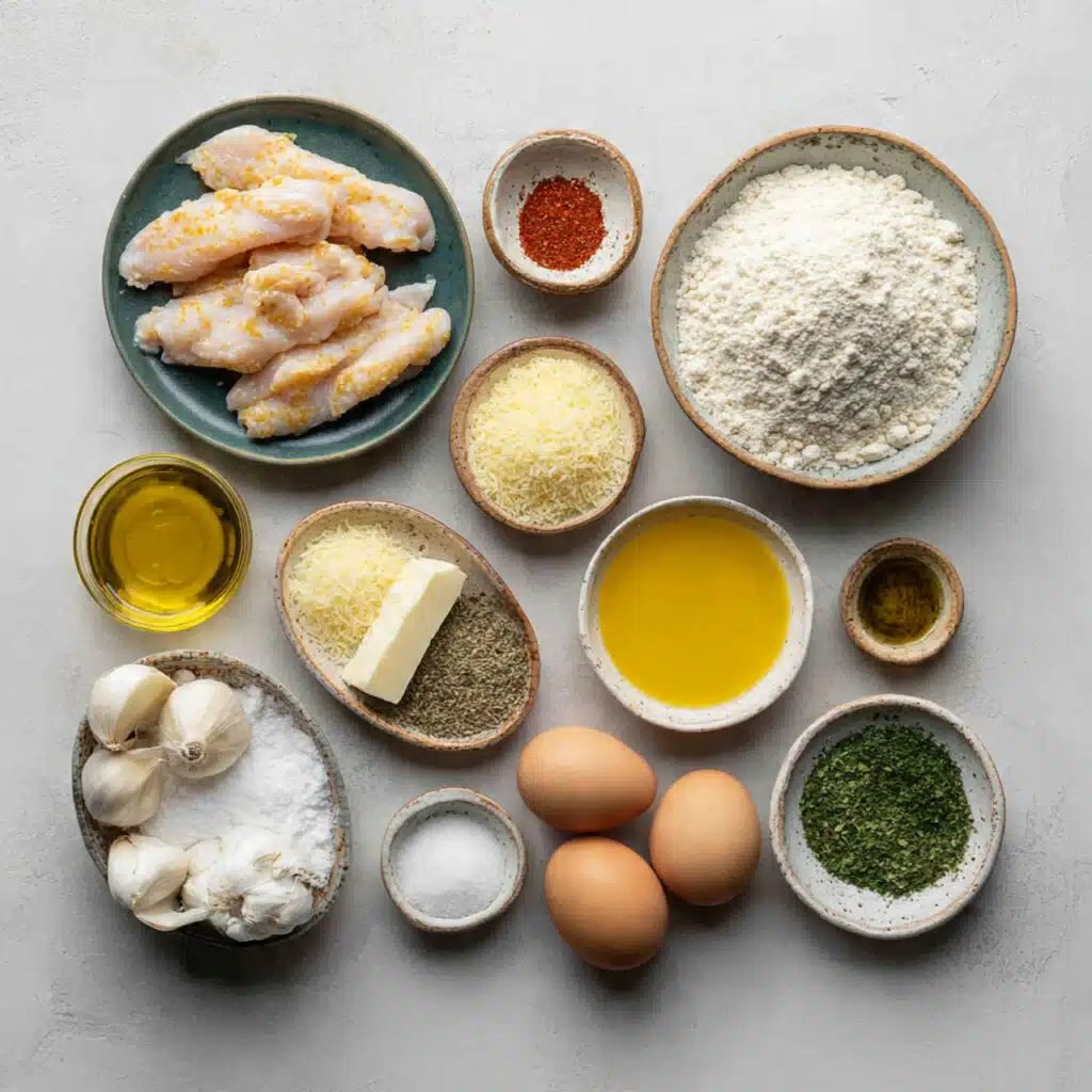 Golden, crispy chicken strips coated in garlic and parmesan, baked to perfection with a crunchy exterior and juicy center.