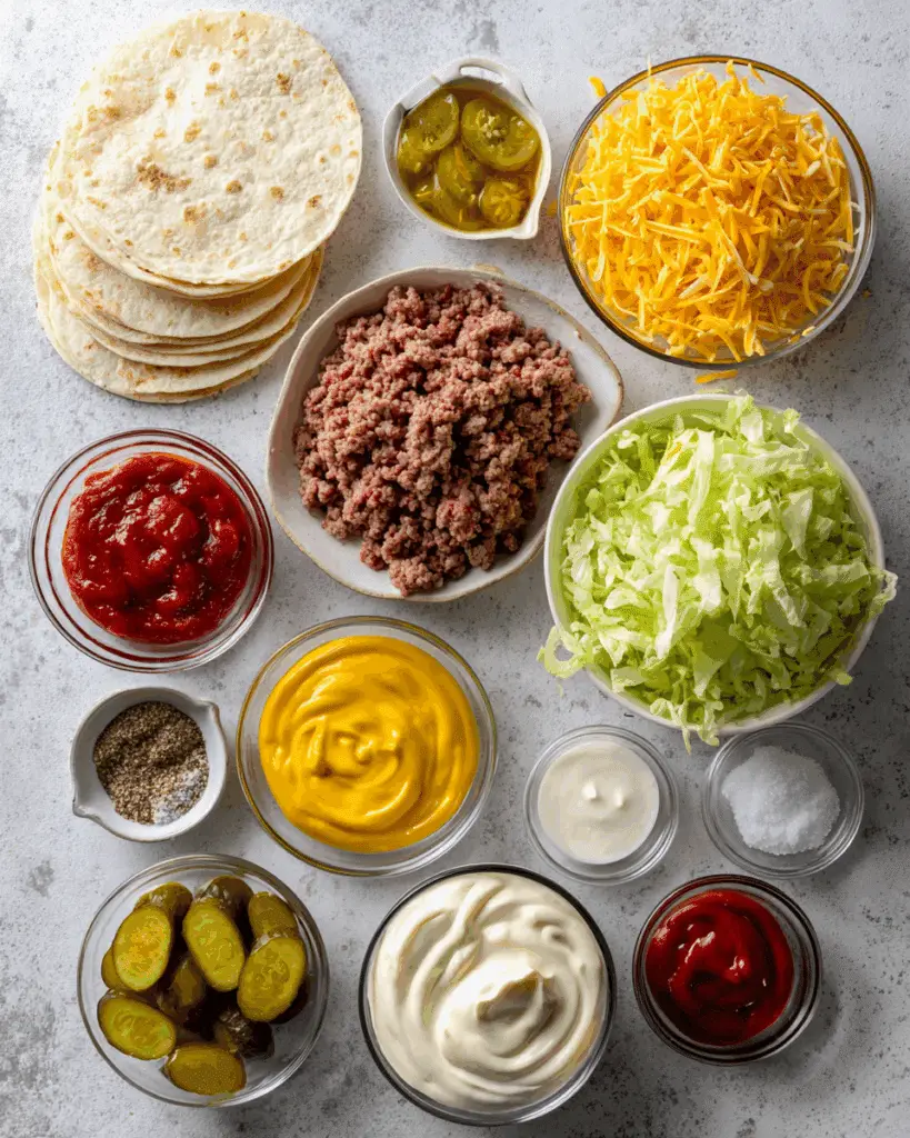 Ingredients in Crispy Smash Burger Tacos with In-N-Out remix sauce