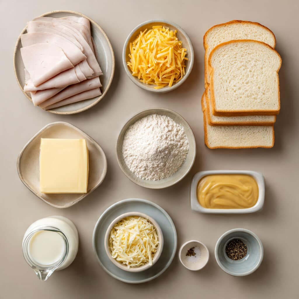 A classic French toasted sandwich layered with turkey, melted cheese, and a creamy béchamel sauce, baked until golden and bubbly.