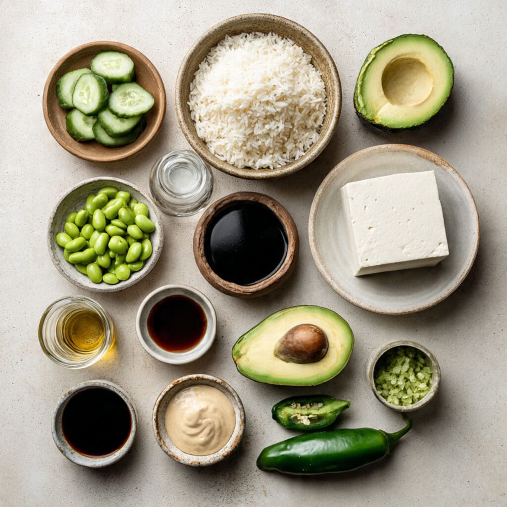 - Assemble the Dish: Divide cooked rice into bowls. Top with tofu, avocado slices, cucumber, edamame, and jalapeño.