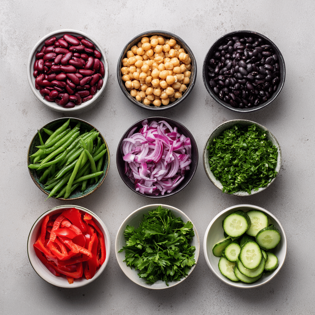 - Combine Ingredients: In the mixing bowl, add kidney beans, chickpeas, black beans, green beans, red bell pepper, cucumber, red onion, and parsley.
