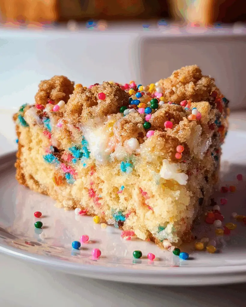 Double Funfetti Crumb Cake is a colorful and festive dessert featuring a moist, vanilla-flavored cake dotted with rainbow sprinkles and topped with a sweet, buttery Funfetti crumb topping. Perfect for birthdays, celebrations, or any cheerful occasion.