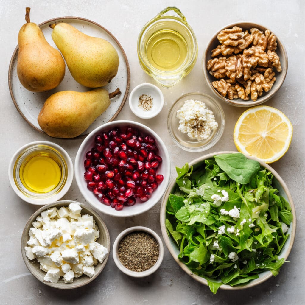 - Assemble the Dish: Add sliced pears, pomegranate seeds, crumbled feta, and chopped walnuts over the greens.