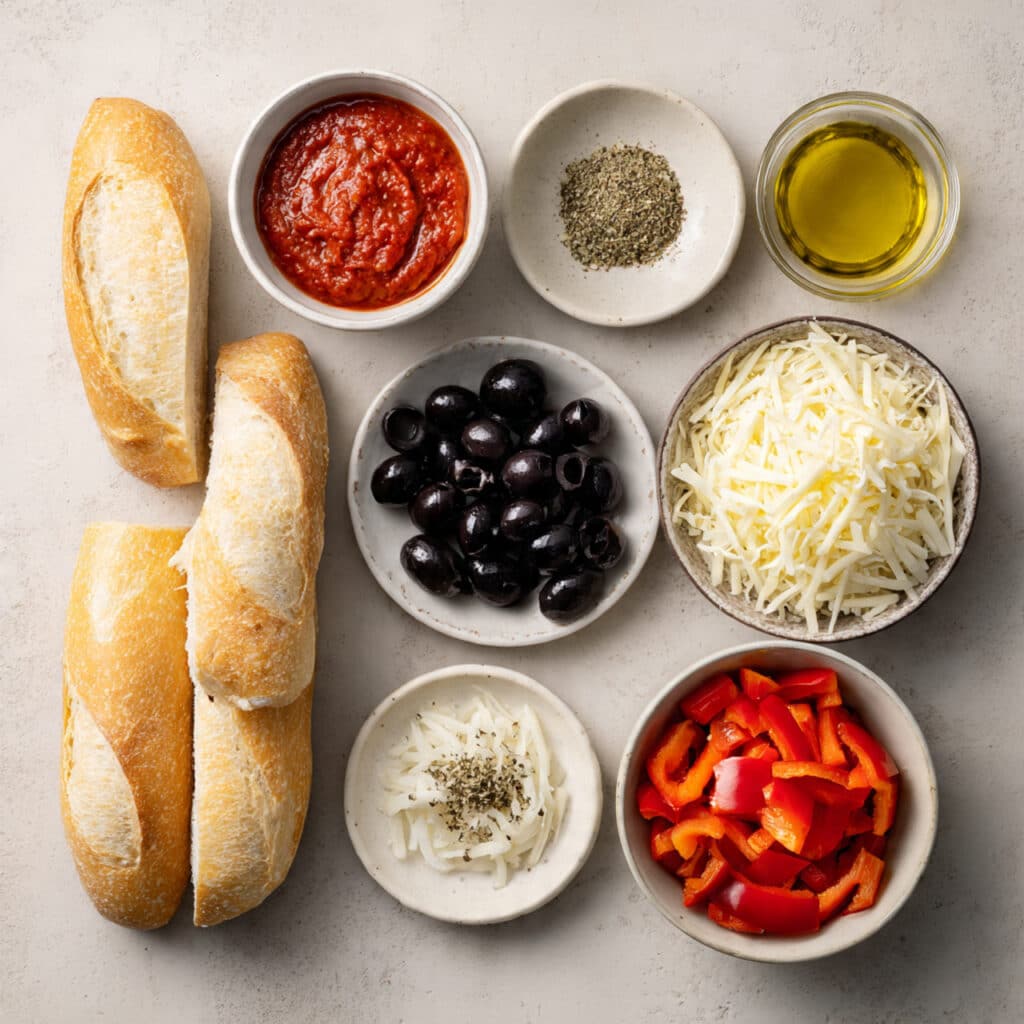 - French Bread: 1 large loaf, sliced lengthwise. This forms the crisp base that holds all the toppings.