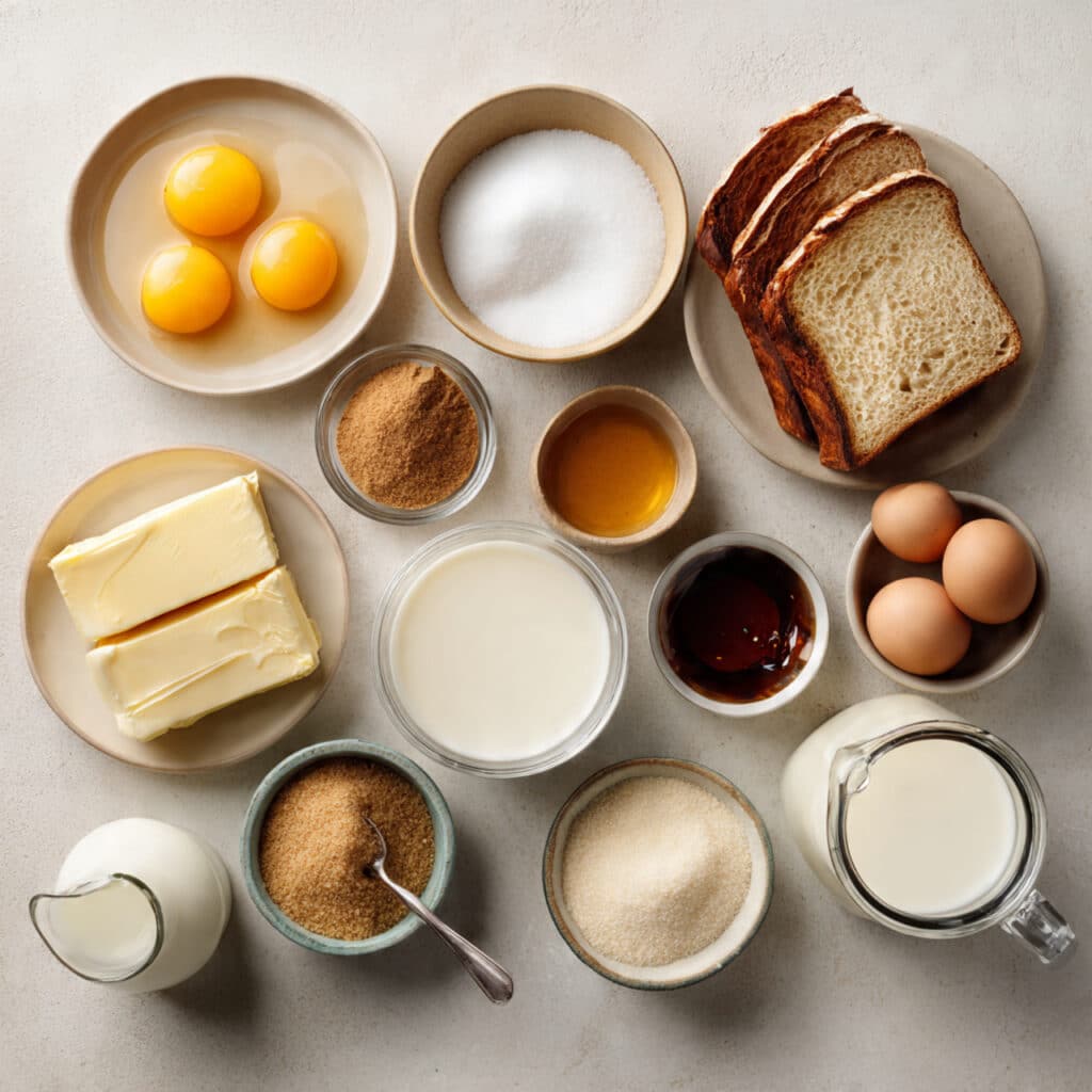 - Thick Bread Slices: 8 slices, slightly stale, they absorb the custard without falling apart