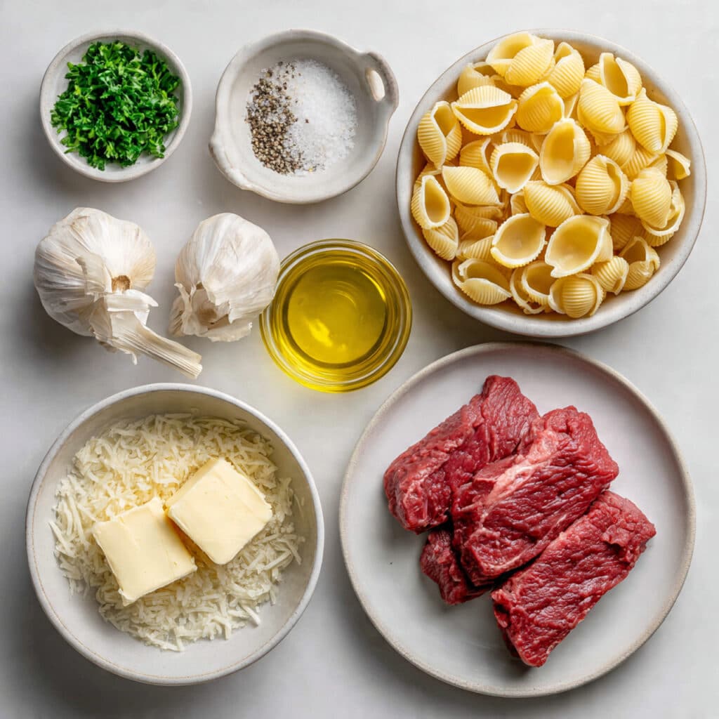 Ingredients in Garlic Butter Steak Bites & Shell Pasta
