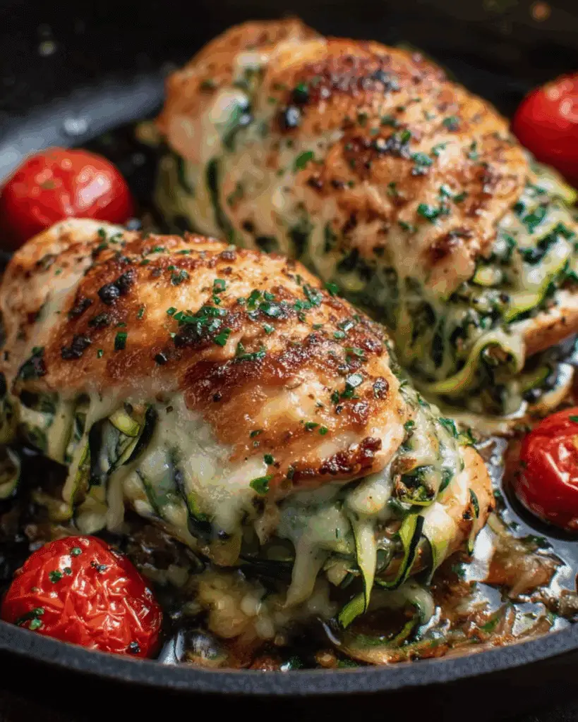 This dish is perfect for those nights when you want something a little more impressive than plain chicken—but don’t want to spend hours in the kitchen. With golden seared edges, a cheesy zucchini filling, and even a burst of cherry tomatoes if you like, this meal is weeknight comfort with a touch of elegance.