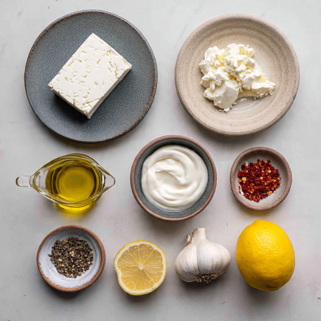 - Combine Ingredients: Add feta cheese, Greek yogurt, garlic, lemon juice, and black pepper.