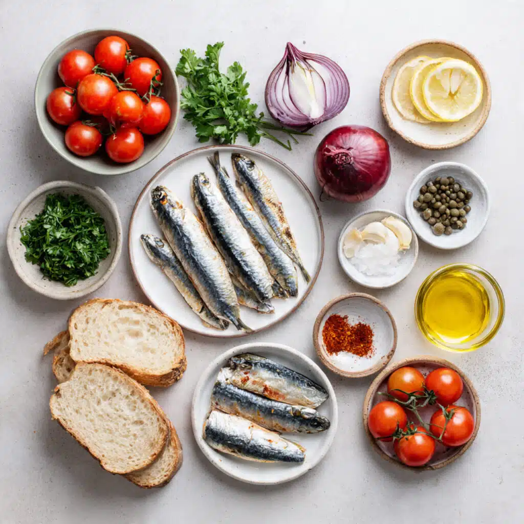 Smoky grilled sardine fillets served over garlic-rubbed sourdough with a fresh tomato, red onion, caper, parsley, and lemon topping. It is quick, vibrant, and packed with rich coastal flavor.