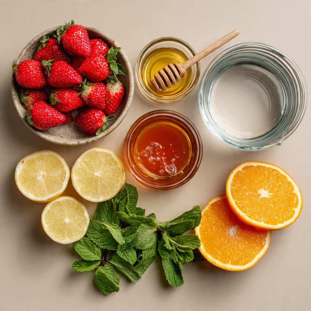 - Chop strawberries, slice lemons and oranges, and gently tear the mint leaves to release their aroma. Dissolve the honey in a bit of warm water.