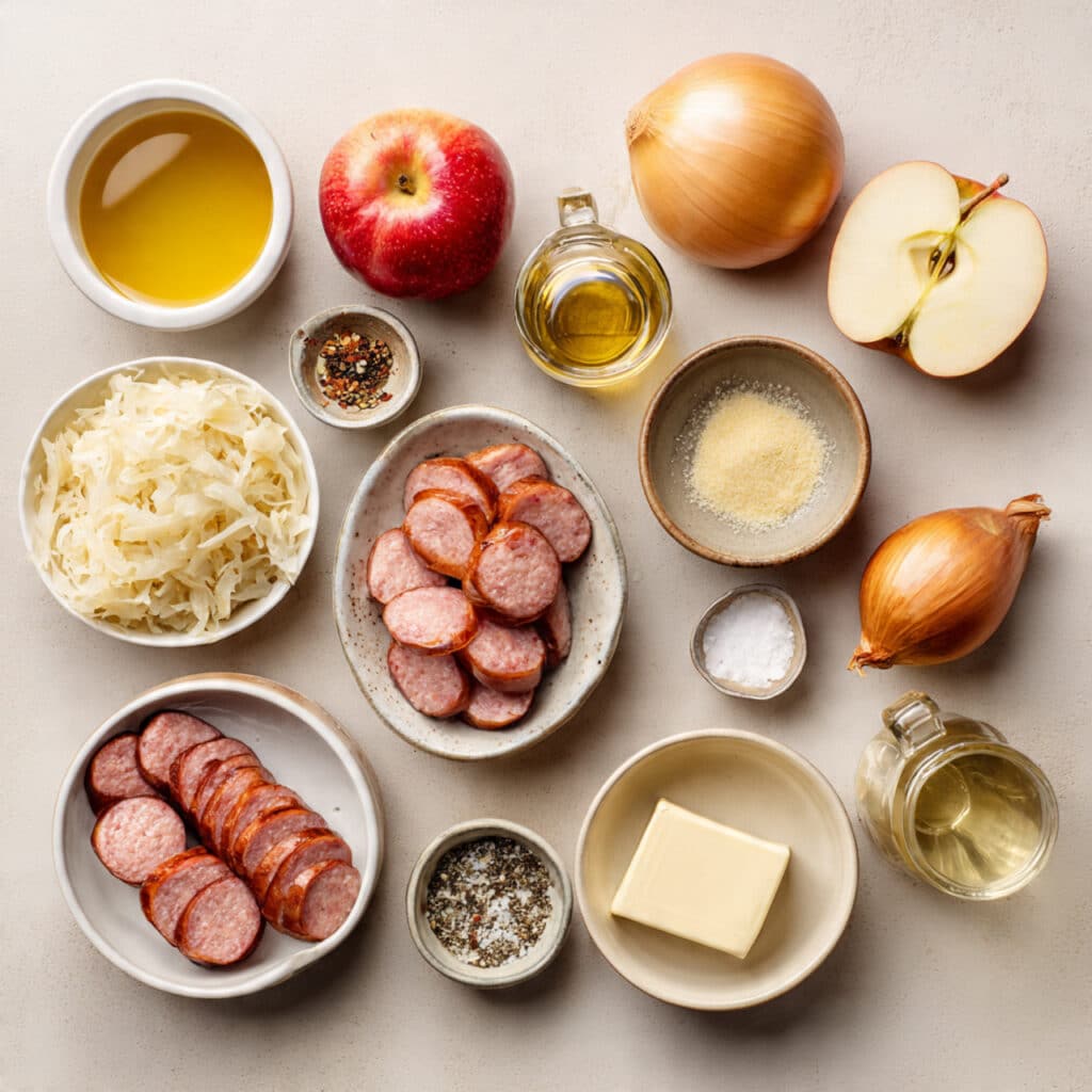 Ingredients in Kielbasa and Sauerkraut Skillet with Apples