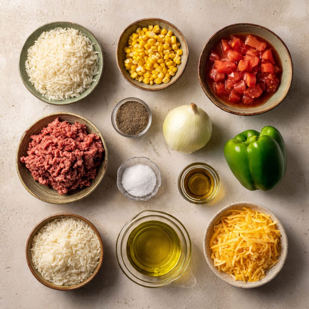 A cozy one-pan dinner made with seasoned ground beef, fluffy rice, tender vegetables, and melted cheddar cheese, all simmered together for a hearty and satisfying meal.