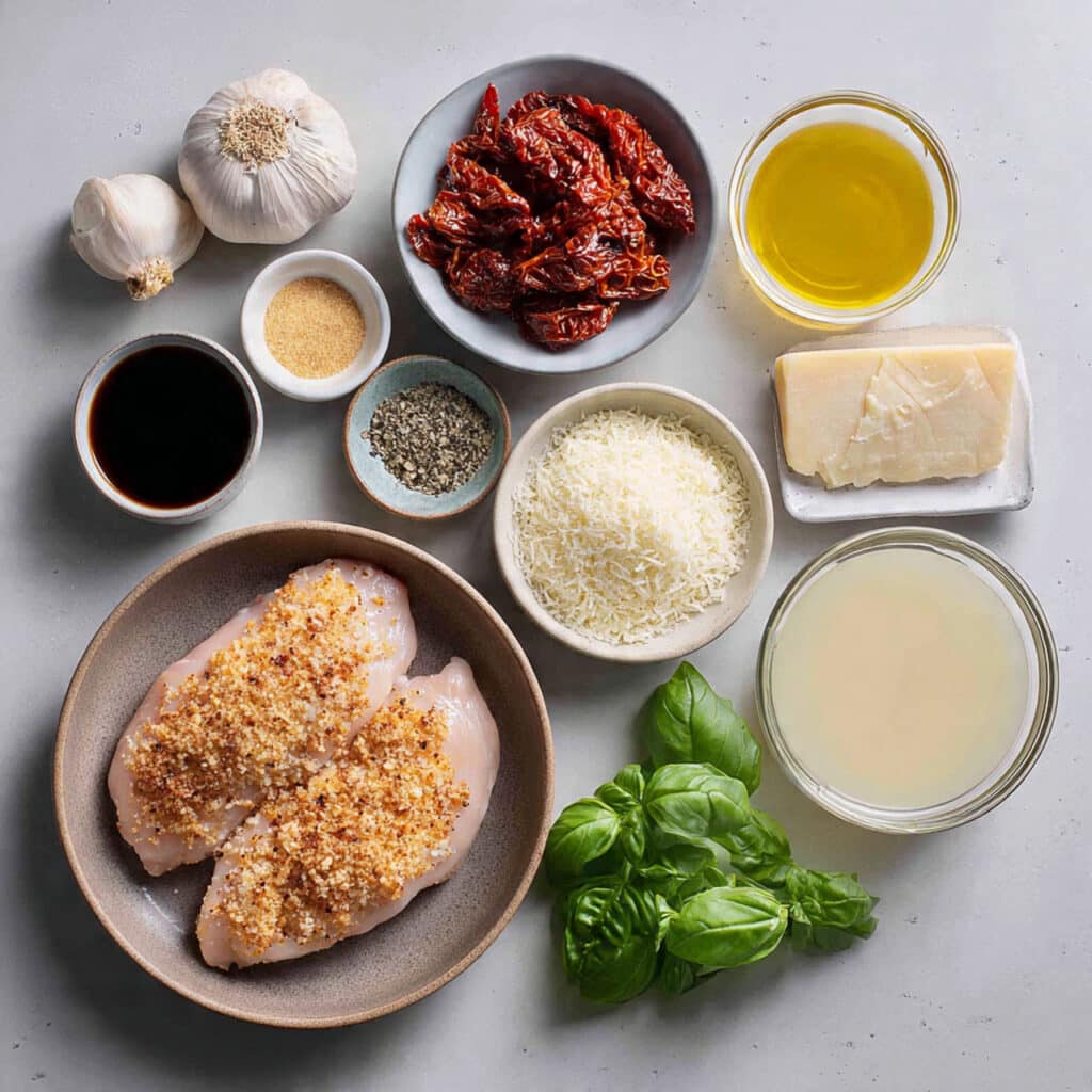 This dish is a harmony of contrasts. The chicken is seared to a golden crust outside but tender and juicy inside. The sauce is creamy but bright, thanks to the sun-dried tomatoes and fresh basil. Parmesan adds a subtle nutty sharpness that lingers on the tongue, while garlic and herbs give the whole thing a savory backbone.