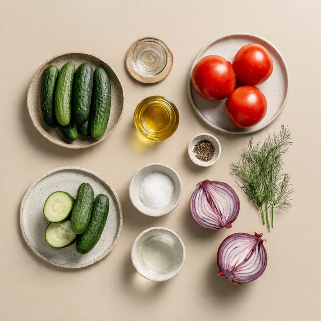 A refreshing blend of cucumbers, tomatoes, and red onions marinated in a tangy-sweet vinegar dressing with herbs. This easy, no-cook dish is perfect for picnics, BBQs, or everyday sides.