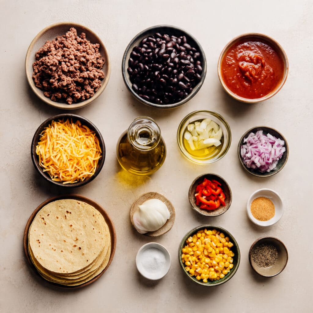 - Combine Ingredients: Heat olive oil in a skillet, cook onion, bell pepper, and garlic until fragrant, then add ground beef and cook until browned. Stir in taco seasoning, tomato sauce, beans, and corn, then simmer gently.