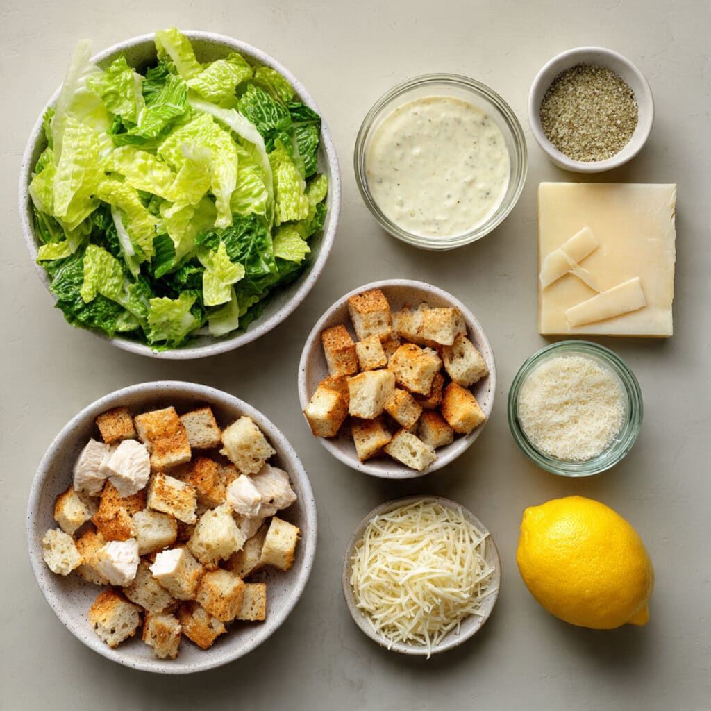 - In a large bowl, combine chopped romaine, diced chicken, Parmesan, and chopped croutons.
