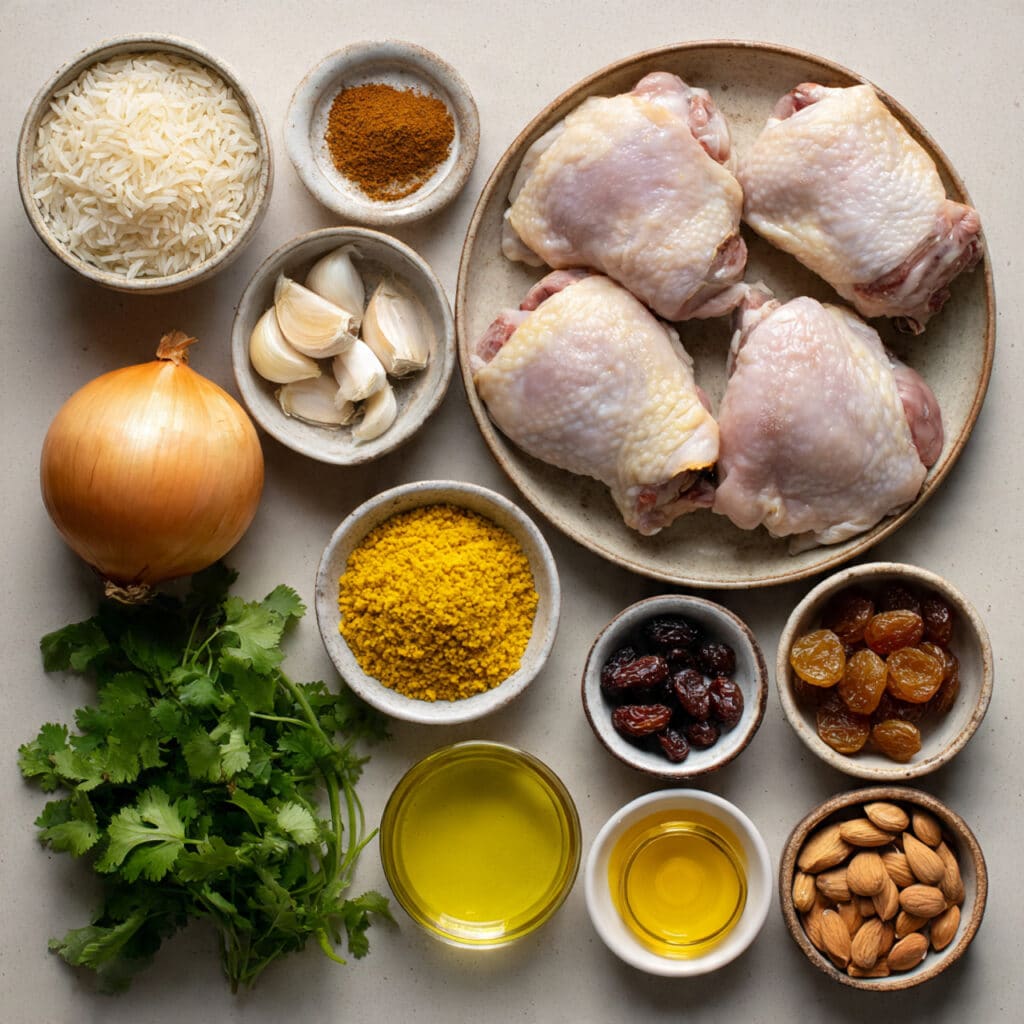 This dish hits all the notes — juicy, tender chicken with crispy edges. Fluffy rice that’s both savory and slightly sweet from the raisins. The toasted almonds bring crunch, and the spices create layers of flavor that deepen as it rests. Trust me, it’s worth every bite.