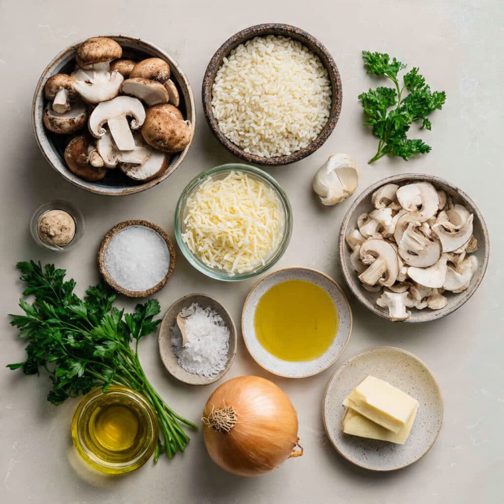 The mushrooms add a rich earthy depth that balances the creamy rice, while parmesan brings a nutty saltiness that ties everything together.