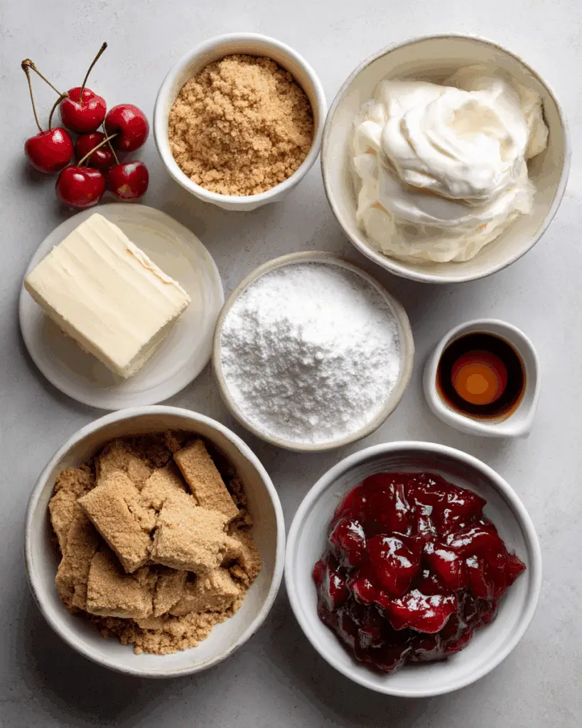 - Cherry Pie Filling: 1 ½ cups — The glossy, fruity crown that completes the dessert.