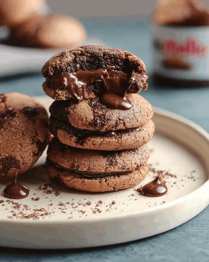 Serve these cookies stacked on a rustic wooden board or arranged in a circle with Nutella swirls piped in the center. A dusting of cocoa powder or powdered sugar adds instant visual drama that makes them stand out on any dessert table.