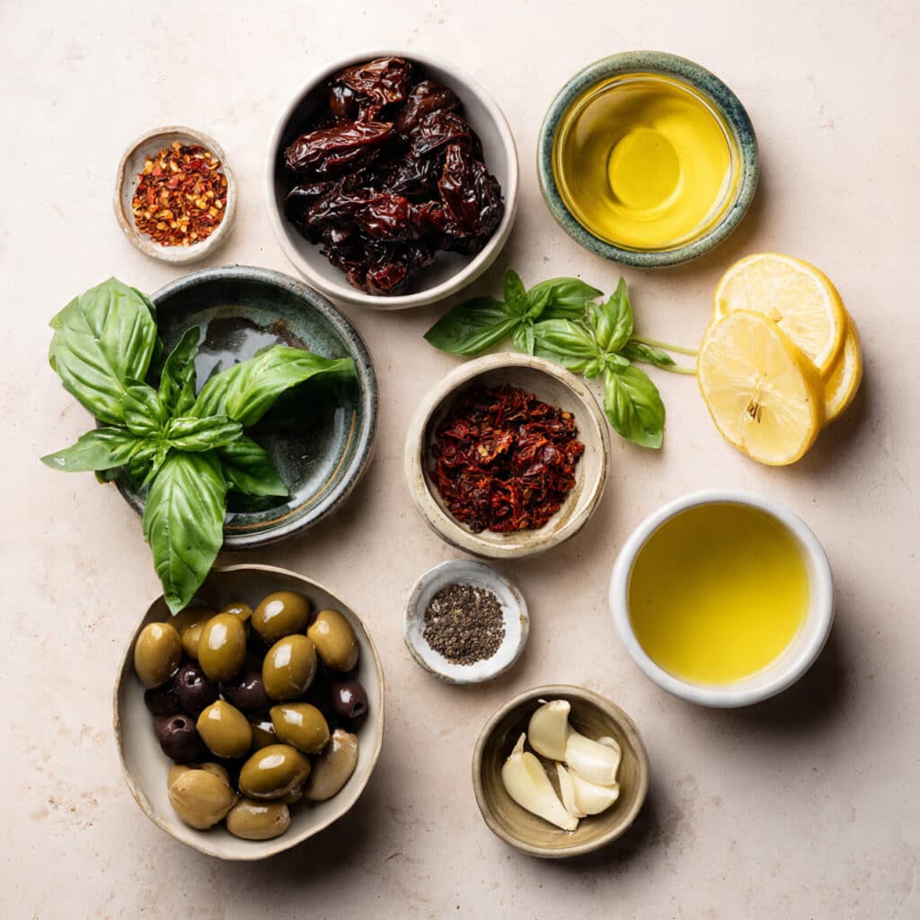 - Combine Ingredients: Add the kalamata olives, sun-dried tomatoes, capers, garlic, fresh basil, lemon juice, olive oil, black pepper, and optional red pepper flakes to a food processor.