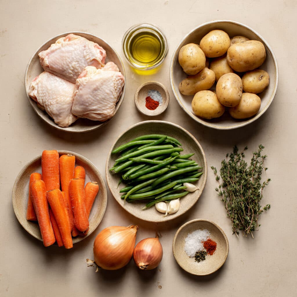 - Cook to Perfection: In the same pan, sauté onion and garlic, then add potatoes and carrots, cook until slightly tender, add green beans, return chicken to the skillet, sprinkle thyme, and cover to cook through