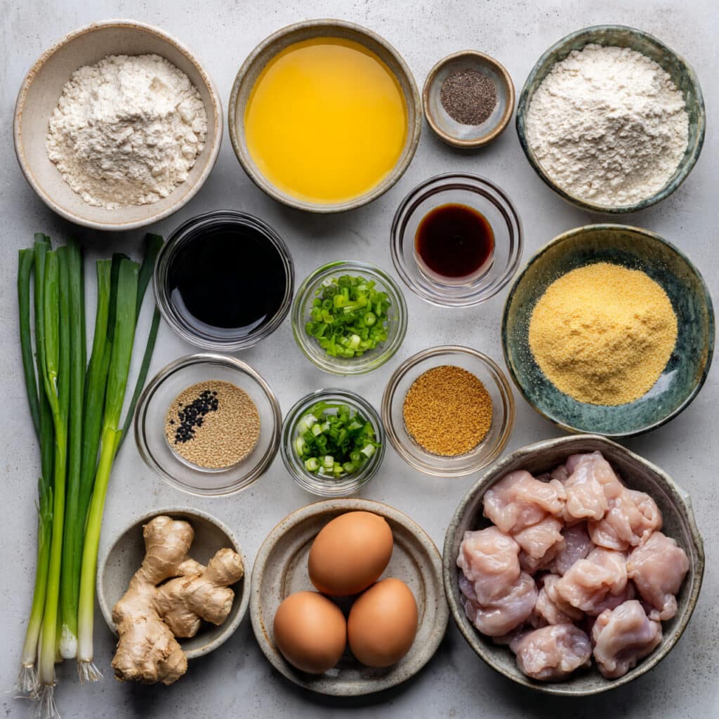 - Boneless Skinless Chicken Thighs: 1 ½ pounds, cut into bite sized chunks. These stay tender and juicy after frying.