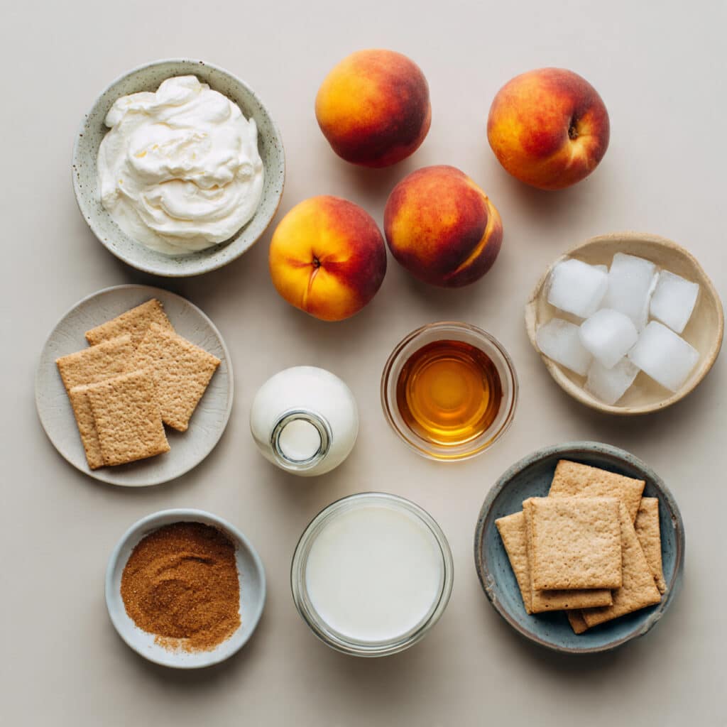- Combine Ingredients: Add peaches, Greek yogurt, milk, honey, vanilla extract, cinnamon, graham crackers, and ice cubes into the blender.