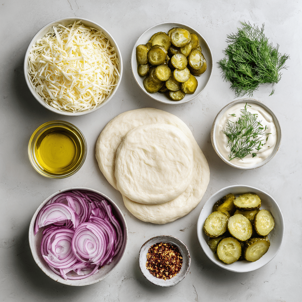 Spread the garlic ranch sauce evenly over the dough. Sprinkle mozzarella generously. Layer on pickles, red onion, and a bit of fresh dill. - Cook to Perfection: