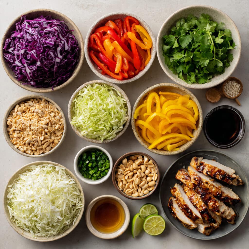 - Combine shredded cabbage, carrots, bell peppers, green onions, cilantro, and grilled chicken in the bowl. Pour dressing over the top and toss well to coat.