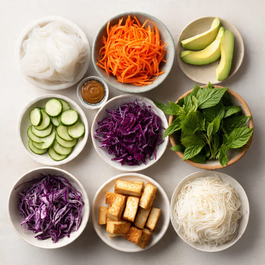 - Combine Ingredients: Slice all vegetables and herbs. Lay out your vermicelli, tofu, and avocado so they’re easy to grab.