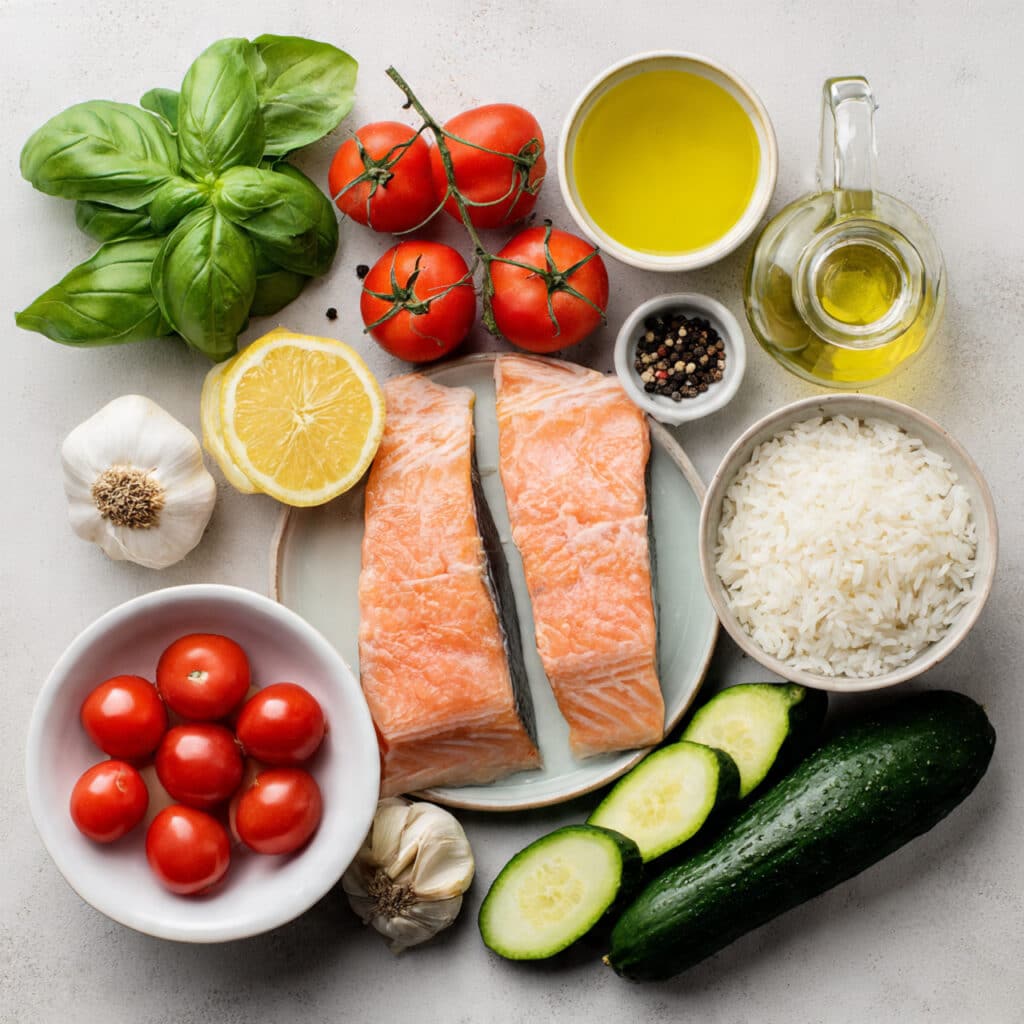 Serve this dish in a shallow bowl with rice on the bottom, salmon over top, and salad on the side. Garnish with a lemon wedge or fresh basil leaves. Pair with a light white wine, sparkling water, or a citrusy iced tea.