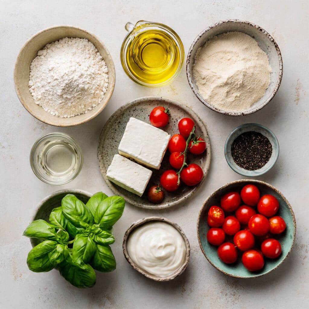 A crisp chickpea flatbread topped with creamy whipped feta and juicy cherry tomato salad. This Mediterranean-inspired dish is fresh, flavorful, and perfect for any meal.