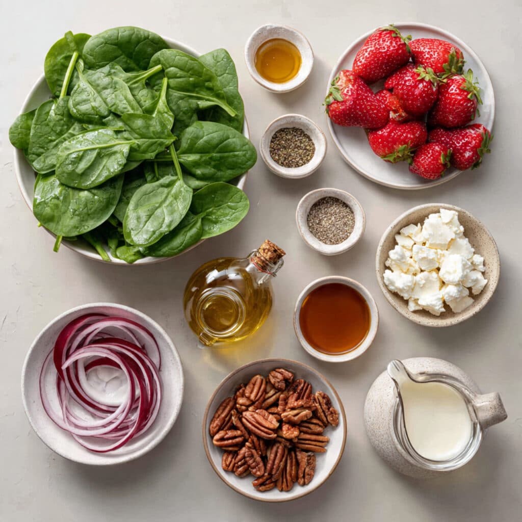 A fresh and vibrant spinach salad tossed with sweet strawberries, creamy goat cheese, toasted pecans, and drizzled with a tangy honey Dijon vinaigrette. Perfect for a light lunch, side dish, or potluck favorite.