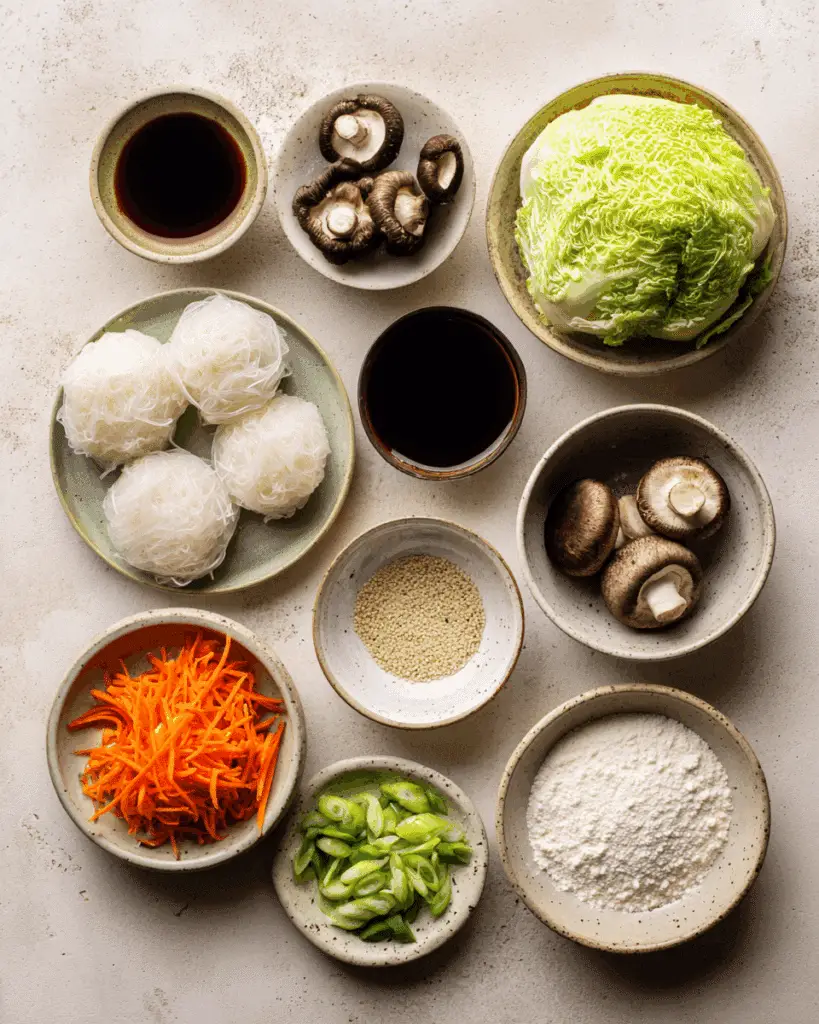 - Combine Ingredients: In a bowl, mix mushrooms, cabbage, carrots, green onions, garlic, soy sauce, sesame oil, cornstarch, salt, and pepper.