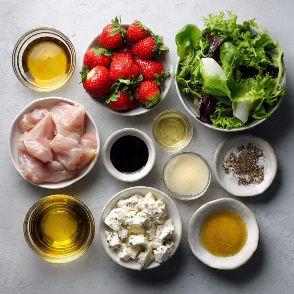 - Assemble the Dish: Place mixed greens in a large bowl, then add sliced strawberries, cooked chicken, and crumbled cheese.
