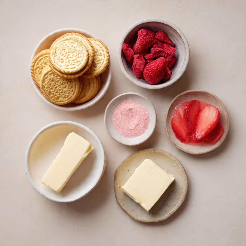- In a food processor, combine the Golden Oreos and freeze-dried strawberries. Pulse until a coarse crumb texture forms.