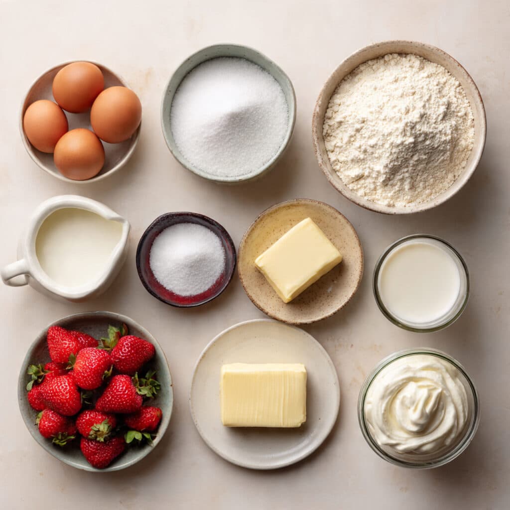 - Granulated sugar: 1 cup – Sweetens both the cake and strawberries.