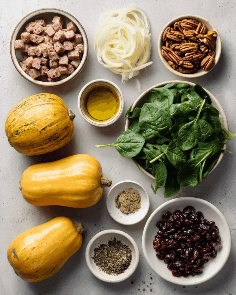 Ingredients in Stuffed Acorn Squash with Sausage, Spinach, Onions, Pecans, & Dried Cranberries