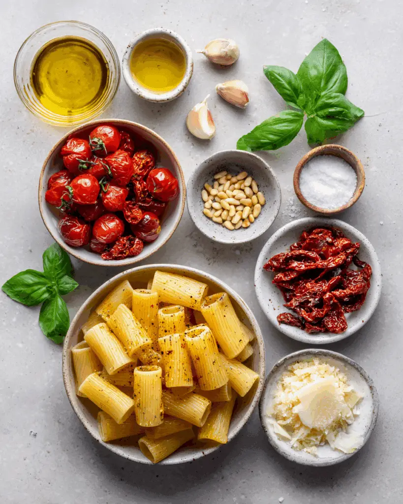 Sun-dried tomato pesto, also known as pesto rosso, is a flavorful twist on the classic Genovese green pesto. Originating from southern Italy, this version swaps in sun-dried tomatoes for basil and brings a deep, savory umami punch. It’s often combined with garlic, Parmesan, olive oil, and sometimes nuts, offering a thicker and more intensely flavored spread or sauce. Paired with rigatoni, which holds onto sauce beautifully, and cherry tomatoes that burst with sweetness, it becomes an ode to Italian countryside cooking with a modern flair.