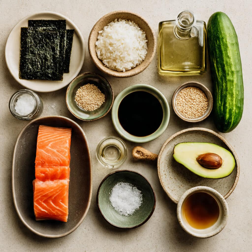 - Avocado: 1 large avocado, sliced. Creamy texture that balances the fish.